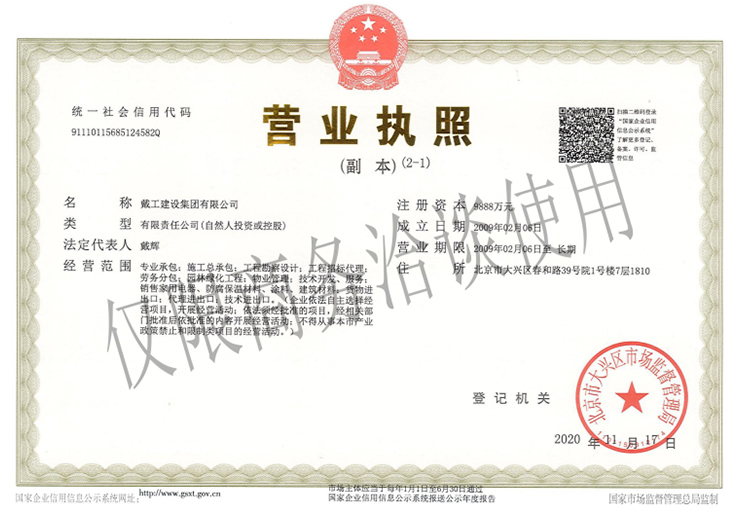 戴工建設(shè)集團(tuán)有限公司,創(chuàng)建于2009年,注冊(cè)資本9888萬(wàn)元人民幣。公司位于北京市大興區(qū)。具有建委頒發(fā)的建筑裝飾裝修專(zhuān)業(yè)壹級(jí),防水保溫工程專(zhuān)業(yè)壹級(jí),建筑幕墻專(zhuān)業(yè)貳級(jí),消防設(shè)施專(zhuān)業(yè)貳級(jí),電子與智能化專(zhuān)業(yè)貳級(jí),特種工程(結(jié)構(gòu)補(bǔ)強(qiáng))專(zhuān)業(yè)不分等級(jí),建筑機(jī)電安裝專(zhuān)業(yè)貳級(jí),環(huán)保工程專(zhuān)業(yè)貳級(jí),鋼結(jié)構(gòu)專(zhuān)業(yè)貳級(jí),建筑工程總承包貳級(jí),建筑裝飾工程設(shè)計(jì)專(zhuān)項(xiàng)甲級(jí),展覽陳列工程設(shè)計(jì)與施工壹級(jí),展覽展示工程壹級(jí)...更多>>